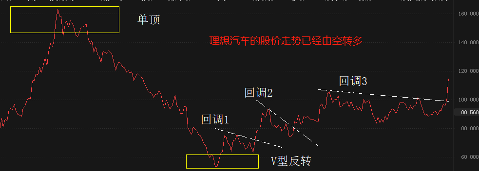 技术角度看,理想汽车的股价走势已经由空转多。2022年6月至10月,持续下跌,形成了单顶部和V型反转两个重要顶底结构。2022年11月开始,理想汽车启动上涨,至今已经度过三次回调,且三次回调都没能破坏多头趋势结构。今日大涨之后,理想汽车股价正式突破回调3的下降趋势线压力,后市大概率出现持续性上涨走势。
