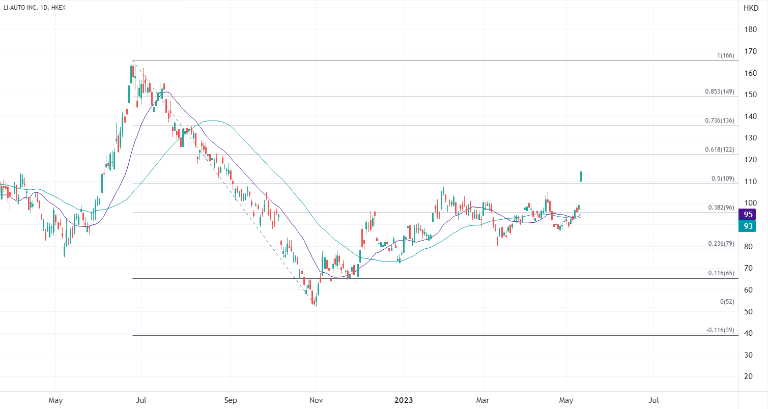 ATFX港股:理想汽车(02015)今早大幅高开11.1%,理想汽车昨日公布第一季经调整净利润14.1亿元(人民币,下同),按年增逾1.96倍,按季增加46.1%,不过毛利率有所下滑。