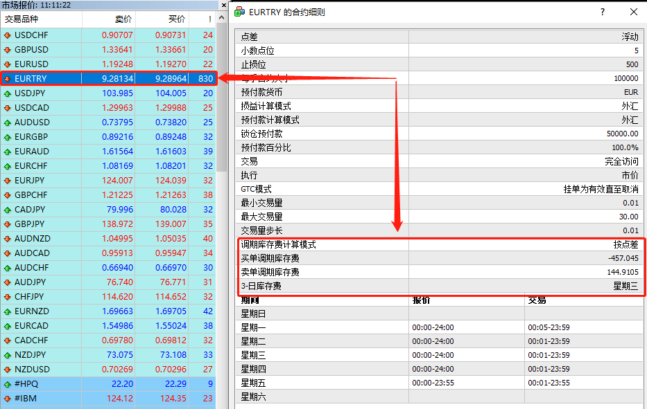 既然套息的原理就来自于高息货币和低息货币的利率差,所以获得正向隔夜利息的诀窍就在于找到MT4所提供的利率差距最大的货币对。欧元区和日本正在执行负利率政策,土耳其基准利率高达15%,所以欧元兑土耳其里拉和日元兑土耳其里拉都是热门的套息货币对。这里以EURTRY为例来进行介绍。可以看出,EURTRY的卖单调期库存费为144.9105;买单为-457.045,显然套息的话应该进行卖出。EURTRY的实时点差为942小点,即便按照周三会有三倍利息计算,卖单隔夜收入144*3=432点,依旧小于942的点差值。如果持有卖单一周的话,利息收入为144*7=1008,该收益大于点差值,可以显示正向盈利。