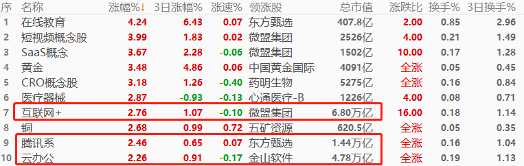 板块角度看,港股市场在线教育板块股以4.24%的幅度领涨,其次是短视频概念股和SaaS板块。大市值板块当中,互联网+、腾讯系、云办公分别出现2.76%、2.46%、2.26%的较大跌幅。涨幅版前十大板块当中,大部分都是昨日跌幅榜前十的板块,表明今日的涨势主要以“超跌反弹”为主基调。
