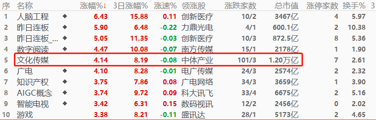 A股市场,人脑工程板块以6.43%幅度领跌,其次是数字阅读和文化传媒。其中,文化传媒总市值1.2万亿,属权重板块。涨幅榜前十大板块中,绝大部分都是非权重板块,虽然涨幅较大,但对大盘的带动作用较弱。综合来看,A股市场今日的上涨格局主要以“文化创意”为主线逻辑,传媒、光电、知识产权、游戏等,均是文化创意产业链的延伸。