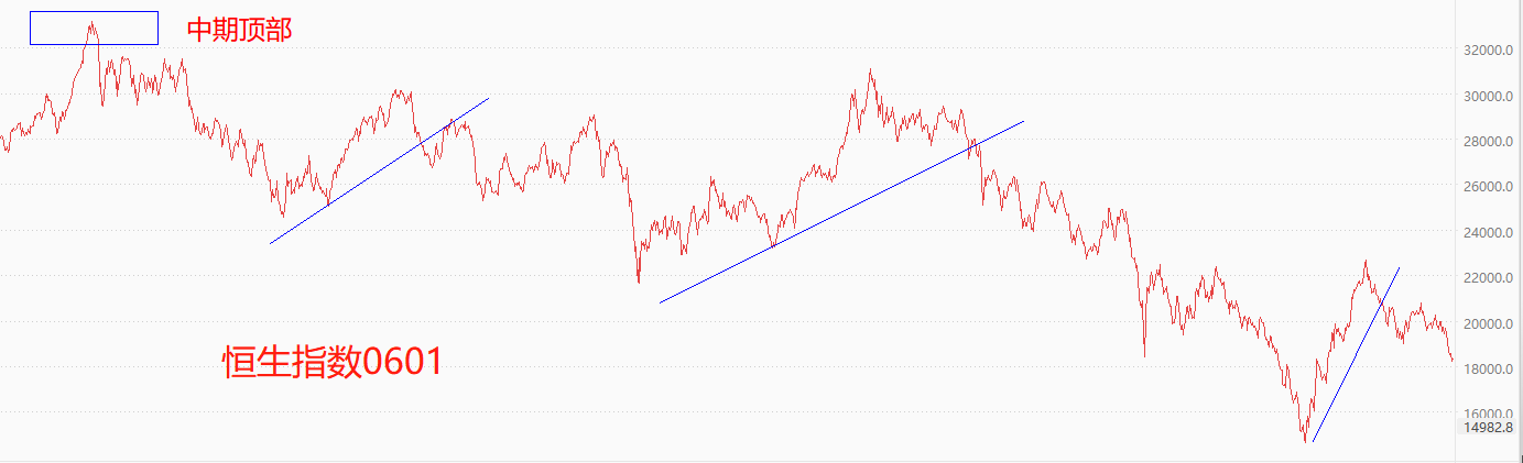 技术角度看,恒生指数处于中期空头趋势,短期为下跌波段。2018年1月份形成中期高顶部,之后开启五年多时间的熊市。期间出现过三次显著反弹,但都没能改变空头趋势结构。最新的一次反弹从去年10月份开始,到今年1月份结束。反弹趋势线已经被跌破,恒生指数已经开启新一轮下跌走势。今日的上涨还不能个改变短期下跌波段的结构,并且金融和互联网两大权重板块尚未发力,中期的多头走势远未到来。