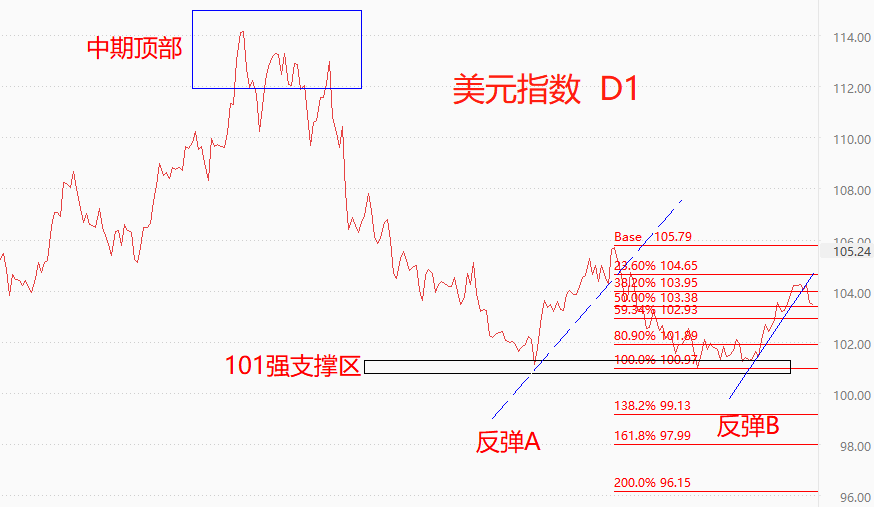 技术角度看,美元指数处于中期下跌趋势之中,短期反弹走势有结束迹象。4月13日触及101强支撑区,随后开启反弹,至5月底反弹至0.618~0.764分位,反弹已经非常充分,后市存在下跌需求。