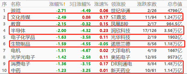 A股市场,游戏板块以2.67%幅度领跌,其次是文化传媒和教育。跌幅榜前十当中,万亿市值板块占五席,表明大市值个股集体表现不佳,今日A股指数大概率表现疲弱,且跌幅不会太小。跌幅榜板块之间的联系并不紧密,既有前期涨势良好今日却大幅回落的文化传媒,也有科技含量较高的半导体和生物制品,还有数码领域的消费电子以及中药板块。缺乏逻辑主线,意味着下跌走势不会持续太长时间。