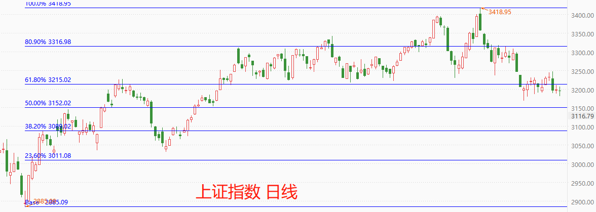 技术角度看,上证指数处于下跌波段之中,且尚未形成支撑结构。市价介于0.382~0.5分位之间,没有达到“回调充分”的最低要求(0.618)。4月18日和5月9日形成两个阶段性高点,有双顶结构特征,预示本轮下跌波段持续时间不会太短。短期支撑位3152,短期阻力位3215,当前市价3193