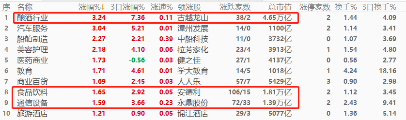 A股市场,酿酒行业以3.24%幅度领涨,其次是汽车服务和船舶制造,其中酿酒行业的总市值在四万亿规模以上,其上涨对股票指数提振作用极强。涨幅榜前十当中,万亿市值板块占3席,权重板块总数偏少,但由于酿酒行业的总市值极高,预计今日上证指数、深证成指表现仍会非常不错。不过,涨幅榜各个板块之间的关联度较弱,无法形成明显的交易主线。