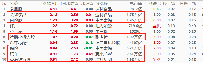 板块角度看,食品股以6.41%的惊人幅度领涨,其次是食品饮料和内险股,后两者总市值均超万亿,对恒生指数的带动作用较强。涨幅榜当中,总市值超万亿的板块占据6席,占比较高,今日大盘蓝筹股表现优于中小盘股。涨幅榜前两位均与“食品”概念相关,形成今日交易主线。另外,与“大金融”相关的板块占据3席;与“新能源车”相关的板块有5席,两者同样具备主线特征,建议重点追踪。