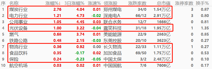 A股市场,煤炭行业以2.76%的幅度领涨,其次是电力行业和公用事业,前两大板块总市值均超万亿,其涨势对上证指数和深证成指的带动作用较强。涨幅榜前十当中,万亿市值板块仅占6席,权重板块总数过半,且排名靠前,A股下午盘有可能扭转上午盘的颓势。涨幅榜当中,与“煤电”相关的板块占4席,形成今年交易主线。与“物流”相关的板块占3席,同样值得重点关注。