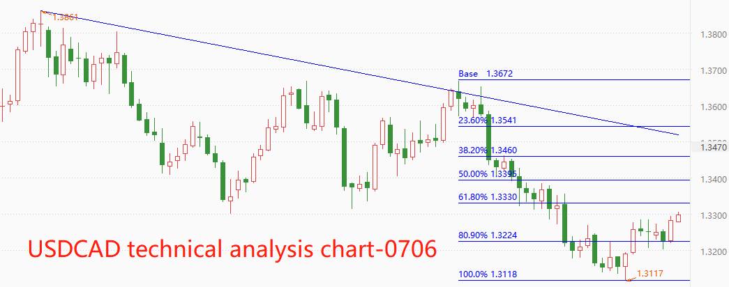 技术角度看,6月27日创出阶段性低点1.3117后,USDCAD进入反弹阶段,截至目前累计反弹幅度1.12%,预计近两周涨势大概率延续。在空头趋势不变的预设前提下,本轮反弹的最高点有可能在1.3395(0.5分位处)之下。如果反弹最高点越过0.5分位,甚至于达到0.618分位处,则空头趋势出现松动迹象,未来有可能迎来趋势转折。