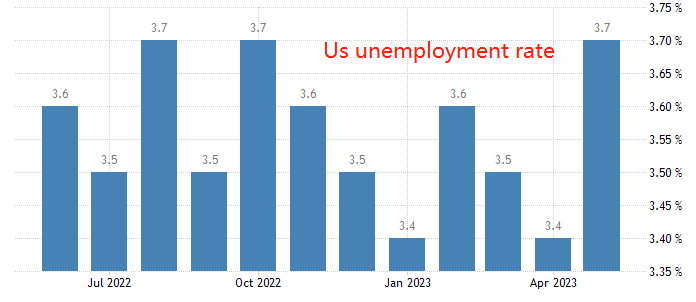 5月份的失业率从3.4%升高至3.7%,劳动力市场初现颓势。过去12个月中,失业率上升的月份有4个月,峰值3.7%,低于充分就业标准5%,总体表现良好。投资市场对于美国失业率上升的担忧,主要来自于高利率、低增速的宏观经济表现。自从一季度的美国银行业流动性危机被妥善解决之后,其它行业并没有出现重大连锁反应,表明美国的宏观经济整体韧性较强。高利率最终将损害失业率数据,但负面影响体现在数据层面,还需要等待较长时间。