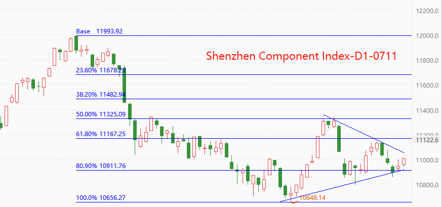 技术角度看,6月8日至今,深证成指形成经典的收敛三角形结构,预计本周将有可能迎来突破。6月8日至19日的上涨波段,最高触及前期下跌波段的0.5分位,处于转势的临界状态,较难对后市发展做出准确判断。受房地产开发市场成交量低迷、通胀率不及预期的影响,深证成指的长期观点仍偏向顺势下跌。