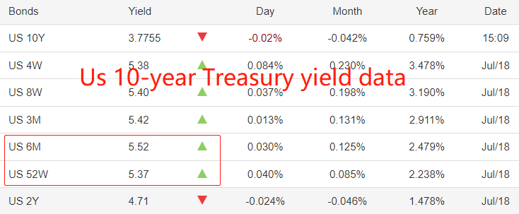 6个月期美债收益率5.52%,高于52周(一年期)美债收益率5.37%,出现长短期债券收益率错配,意味着美联储降息的时间点有可能在半年之内。