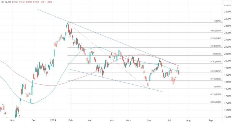 ATFX:昨日港股因为台风停市后,今日复市后低开,无可避免跟随昨日的内地经济数据走低,半日跌逾400点,失守万九关口,恒指、国指分别跌2.17%和2.48%。