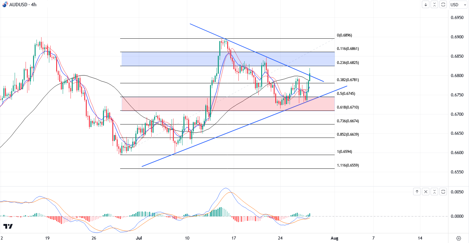 昨日走弱的澳元今早跟随非美货币反弹,看日内能否突破自本周以来的下行趋势线阻力站稳0.6800上方。昨日公布数据显示,由于假期成本和汽油价格下降,澳大利亚第二季度通胀放缓幅度大于预期,CPI环比上涨0.8%,这是自2021年第三季度以来的最小涨幅,这表明再次加息的压力减小,澳元汇率短线大幅走低0.9%后止步两连涨。