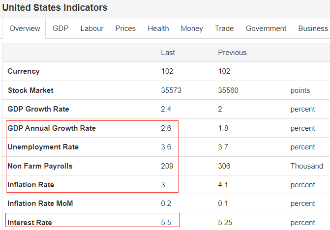 从已经公布的经济数据看,美国经济不存在衰退或者“硬着陆”的可能性。首先,GDP季度增速年率为正值,且二季度增速高于一季度,复苏态势显著。其次,劳动力市场的核心指标——失业率,最新值3.6%,低于自然失业率4%,劳动力依旧处于供不应求状态。第三,高通胀问题已经不复存在,最新CPI年率增速降低至3%以下,逼近美联储调控目标2%。