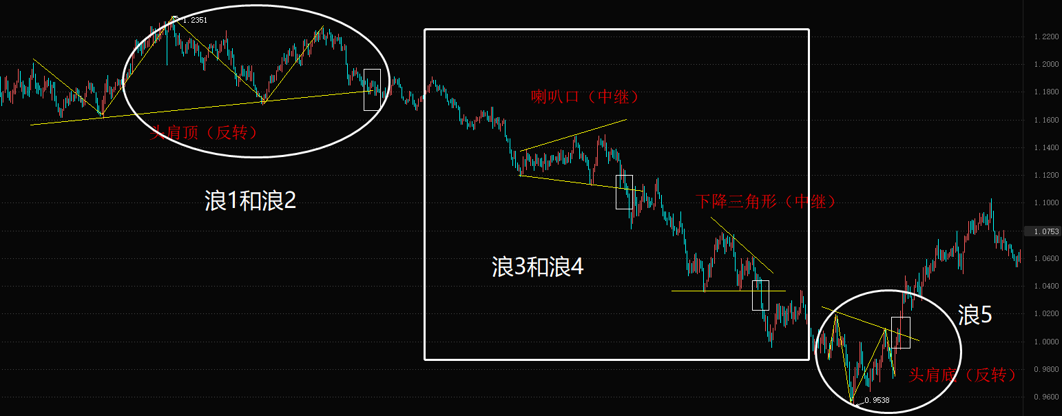 那么如何将形态理论和波浪理论融合到一起呢?答案在上图中已经显而易见。头肩顶形态是波浪理论的浪1和浪2,两个中继心态形成浪3,也就是主跌浪,它的幅度最大,持续时间最长。头肩底形态构成浪5和反向浪A,它意味着五浪驱动结构的结束。