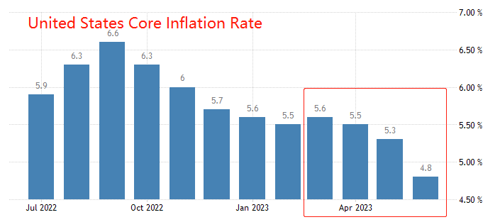 市场预期核心CPI年率将保持4.8%不变,这改变了过去四个月连续下降的趋势。7月份,美国制造业PMI为49,处荣枯线下方,收缩状态,表现不佳;服务业PMI为52.3,虽然处于荣枯线上方,但已经连续三个月下降,前景不乐观。三年大流行期间,美国政府划拨大量财政资金补贴家庭收入,比如经济补助金,及间接援助如驱逐租户禁令及学生贷款延期偿还,这导致美国家庭拥有总计超2万亿美元的超额储蓄。这部分超额储蓄形成了强大的购买力,令美国的商品供不应求、企业不断招工。截至目前,超额储蓄仅剩约8%,强需求状态接近尾声。综合各方面情况看,美国7月份的经济表现不佳,核心CPI年率可能会如预期一般保持稳定,但更大的概率是继续下行。