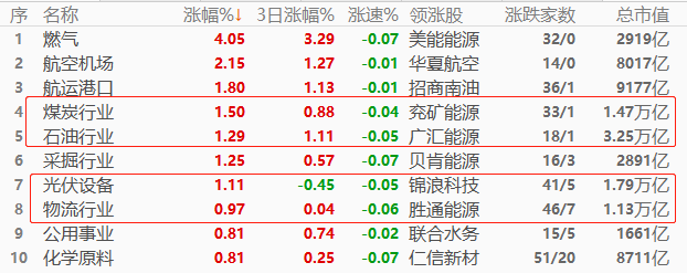 A股市场,燃气以4.05%的幅度领涨,其次是航空机场和航运港口。涨幅榜前十中,总市值超过万亿的占4席,占比未过半,对沪指的带动作用一般。涨幅榜当中,与“能源”相关的板块占5 席,形成今日的交易主线。A股三大权重板块:银行、酿酒行业、半导体的涨跌幅分别为-0.63%、-0.63%、-0.1%,普跌但跌幅有限,对A股指数形成一定程度拖累。
