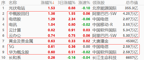 跌幅榜前三的板块分别为燃气、证券、采掘行业,跌幅介于2.23%~3.06%之间。