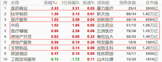 A股市场,医药商业以2.53%的幅度领涨,其次是化学制药和医疗服务。涨幅榜前十中,总市值超过万亿的占5席,占比一半,对沪指的带动作用显著。涨幅榜当中,与“医药”相关的板块占6席,形成今日的交易主线。A股三大权重板块:银行、酿酒行业、半导体的涨跌幅分别为-1.1%、-1.33%、-1.07%,普跌且跌幅较大,对A股指数形成严重拖累。