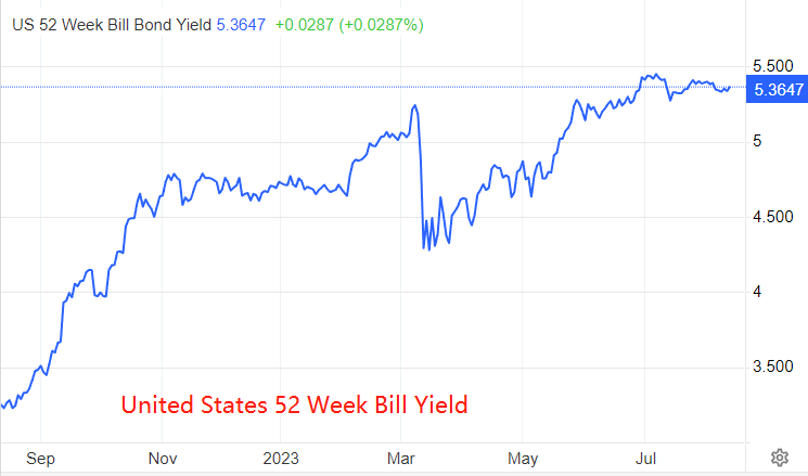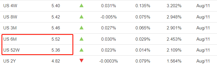 一年期美债收益率5.3647%,数据公布前后未出现大波动。6月末至今,一年期美债收益率保持在5.25%~5.45%区间内,没能迭创新高。7月末以来,波动区间收窄至5.35%~5.45%。相同时期的美元指数表现出与一年期美债收益率基本相同的波动特征。收益率钝化,意味着债券市场不再押注美联储激进加息。假若一年期国债收益率回落,预计美指将共振性下跌。
