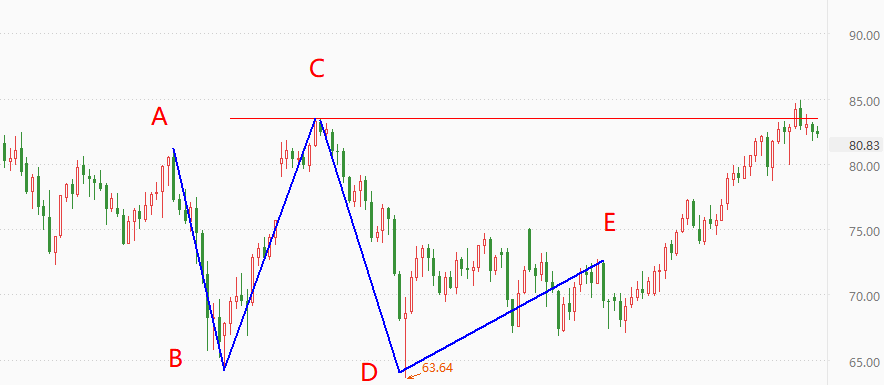 A-B-C-D-E构成经典双底结构,C点所在直线为颈线位。8月9日,WTI价格大涨1.57%后,突破C点且收盘其上,证明双底结构发挥了应有作用。最新市价82.25美元,重归C点之下,对于C点的突破尚不稳固。经验看,突破关键阻力位后往往触发显著回调,现阶段短线观望为宜。