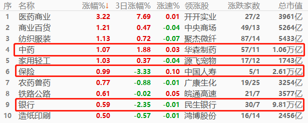 A股市场,医药商业以3.22%的幅度领涨,其次是商业百货和纺织服装,其中医药商业已经多次跃居涨幅榜第一位。涨幅榜前十中,总市值超过万亿的占3席,占比较低,对沪指的带动作用一般。涨幅榜当中,与“医药”相关的板块占3席,形成今日的交易主线。A股三大权重板块:银行、酿酒行业、半导体的涨跌幅分别为0.59%、0.01%、-2.09%,两涨一跌,表现尚可但半导体板块跌幅过大,对A股指数起到抑制作用。