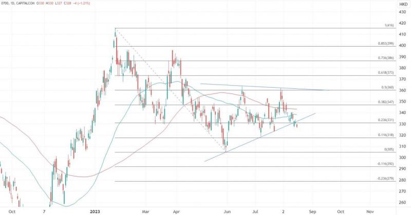 腾讯股价绩前测试了逾三周低位,如果业绩带来惊喜可以展望重新测试均线上方,所以关注340至347的阻力。到如果维持形态下方,则留意318为目标,更低支撑落在5月底低位305港元。