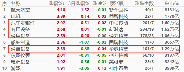 A股市场,航天航空以4.1%的幅度领涨,其次是电机和汽车零部件。涨幅榜前十中,总市值超过万亿的占4席,占比一般,对沪指的带动作用一般。涨幅榜当中,与“机电设备”相关的板块占7席,形成今日的交易主线。A股三大权重板块:银行、酿酒行业、半导体的涨跌幅分别为-1.3%、1.87%、1.68%,两涨一跌且涨幅较大,对A股指数起到提振作用,下午盘有可能延续涨势。