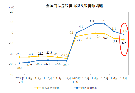 据统计局数据,1—7月份,商品房销售面积66563万平方米,同比下降6.5%;商品房销售额70450亿元,下降1.5%。房地产市场成端不活跃,导致上游开发商拿地热情不高。土拍是资金密集型的环节,地产开发商缺乏高溢价拿地的信心,自然降低对银行信贷资金的需求,一年期LPR利率调降也是对市场供需的反应。