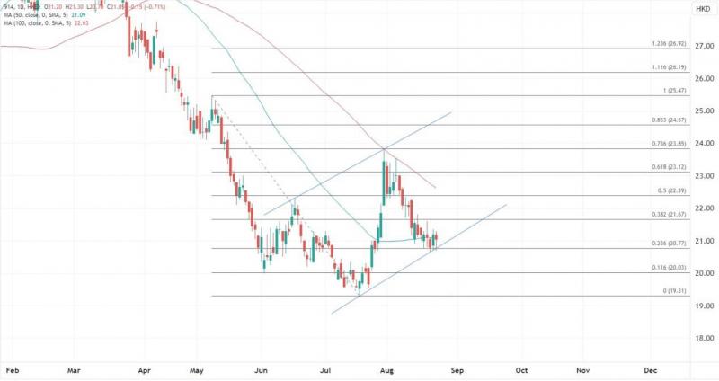 海螺水泥目股价自7月底上试100日均线被拒后再度调整,当前盘整在50均线处,连同自6月以来的上行通道底部预计可以带来支撑,看是否能否重返22港元上方。但如果跌势继续扩大,则将下望前低支撑在19.31港元。