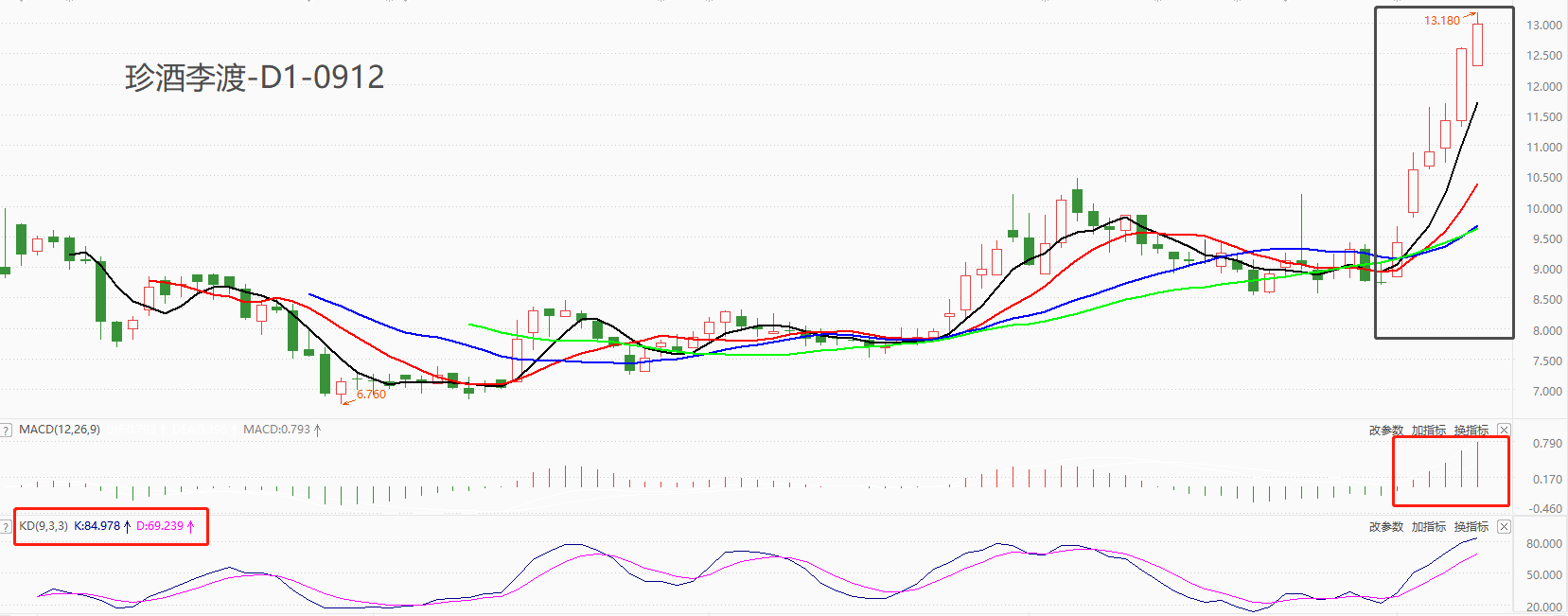 ATFX港股:4月27日,珍酒李渡港交所上市,开盘价9.0港元,至今日盘中最高价13.18港元,累计涨幅46.44%。六个交易日之前,珍酒李渡的市价仅有8.75港元,甚至低于上市开盘价。近五成的涨幅,均由最近六个交易日的迅猛上涨造就。技术角度看,最近五根K线全阳,做多热情浓厚;均线系统呈多头结构排列,9月5日市价有效突破MA30后,至今未有显著回落;MACD连续五根柱线处于零轴之上,中短期趋势偏多;KD指标的快慢线数值分别为84.9、69.28,已经接近超买区间,存在技术性回调的可能性。综合来看,珍酒李渡的股价短线涨势迅猛,中期多头趋势也较为稳固,但震荡指标即将给出回调信号。