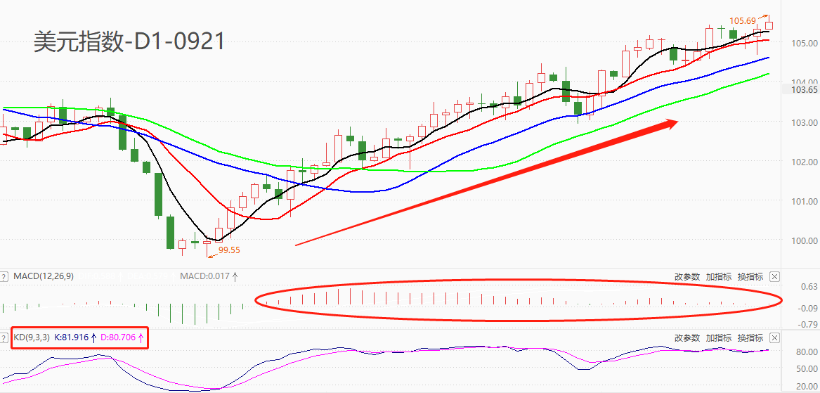 技术角度看,美元指数最近五根K线三阳一阴一十字星,所有K线的实体都较小,短线偏弱势多头。均线系统早在8月初就已经形成多头排列,中期趋势为显著多头。MACD指标的柱状线长时间处于零轴上方,但最近9个交易日的柱线严重收缩,预示多头上涨力度衰竭。KD指标的读数分别为81/80,处于超买线警戒线80上方,继续上涨将面临越来越大的阻力。综合来看,大部分技术指标支持美元指数延续多头涨势,但继续上涨的动能和空间已然不大,需警惕随时可能出现的回调波段。