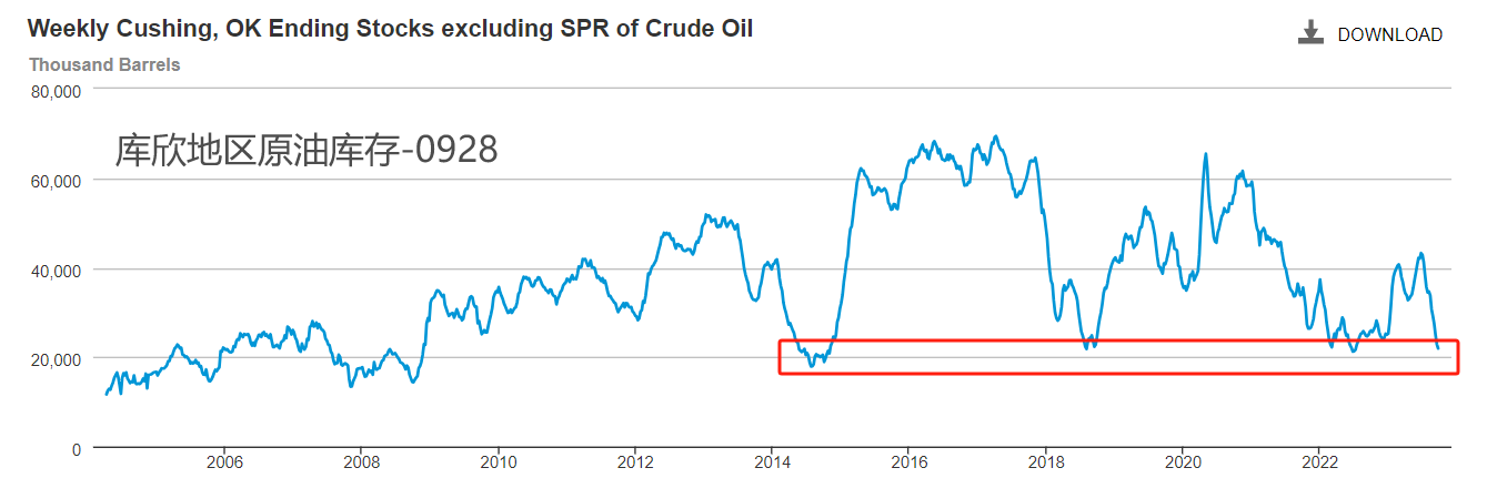 库欣地区原油库存数据逼近近十年以来的低点,最新库存总量为2195.8万桶,相比上一周减少了943万桶,大超市场预期。大宗商品价格波动具有与库存数据的显著共振行,在库欣地区原油库存没能回升之前,WTI价格难言趋势性回落。