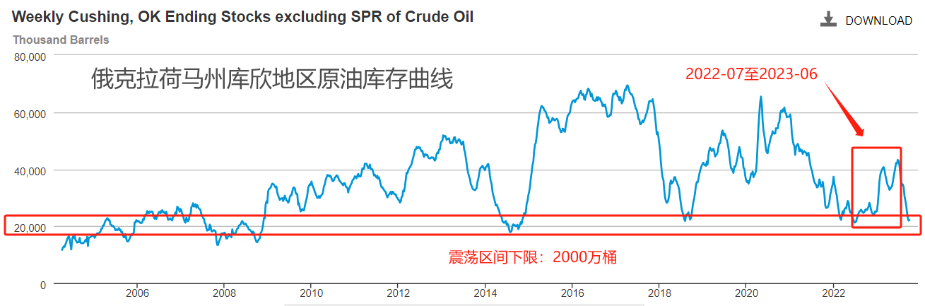 ATFX期市:美国最大的原油存储中心——俄克拉荷马州库欣地区,最新原油库存总额为2209万桶。2014年至今,库欣地区原油库存的震荡下限就在2000万桶左右,过去9年时间,库存总额在逼近该下限时,都会出发强劲的库存曲线反弹。比如2022年7月至2023年6月的大反弹,就是在库存触及2126.1万桶后开启的。这段时间里,WTI价格从最高点111.45美元下跌至63.64美元,累计跌幅达到42.89%。由此可见,库存地区原油库存曲线能够很大程度上主导WTI的价格走势。今年7月份以来,库欣地区原油库存急剧下降,WTI价格也随之上涨,最高触及95.03美元。但是,在库存原油曲线没有显著反弹的情况下,WTI价格却在国庆节期间从95美元骤降至最低81.5美元,令市场人士措手不及。