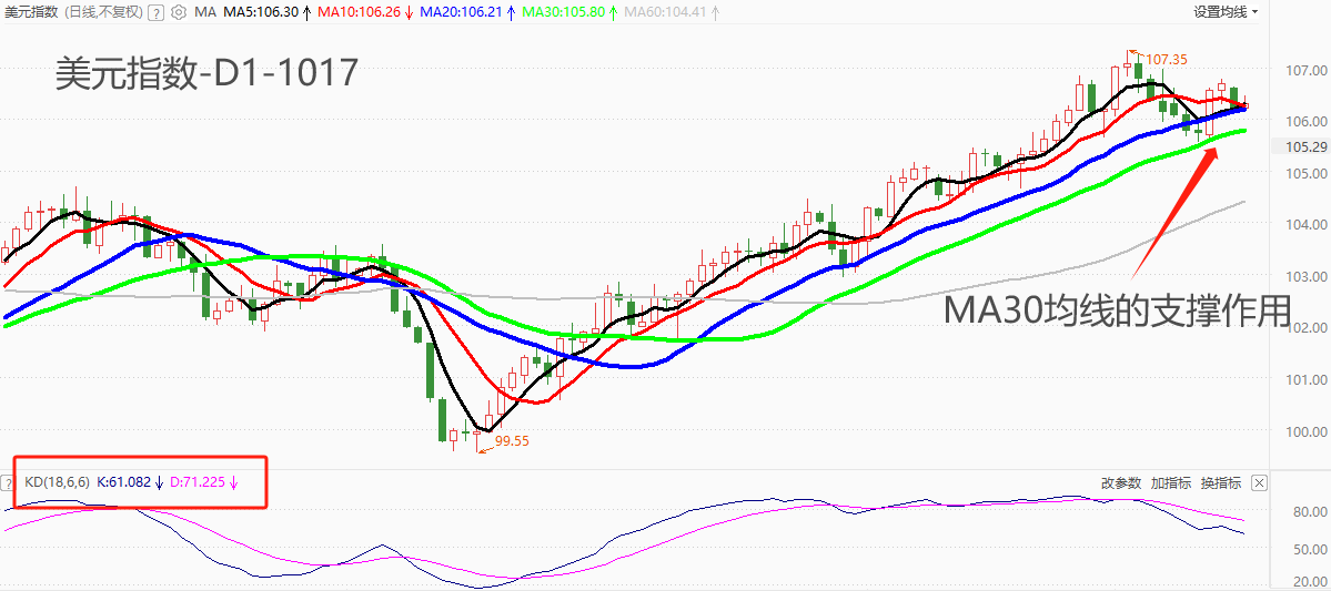 技术角度看,美元指数不单受到MA30均线的支撑,代表中长期趋势的MA20/MA30均线还呈现出向上的发散排列,代表中长期多头趋势表现依旧非常稳固。KD指标的读数分别为61/71,处于超买区域向超卖区域的运动过程中,距离超卖线20仍有较大距离,意味10月4日开始的回落走势还将持续一段时间。KD指标的判断与均线系统判断存在矛盾点,且市价距离MA30均线仍较近,有可能因为未来的长阴线而下破MA30,所以技术角度看,美元指数仍存在下跌的可能性。