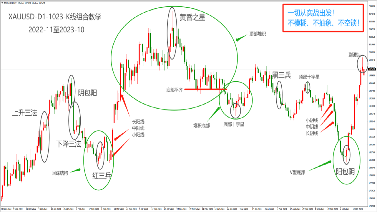 K线组合是两根或以上K线按照特定顺序排列后的固定结构。对K线描述最为全面的书籍是《酒田战法》,作者为上世纪七十年代的本间宗久(酒田是其出生地),从大米市场的价格波动中,发现了K线组合的魅力。比较经典和常用的K线组合有红黑三兵、阳包阴/阴包阳、上升/下降三法。接下来我们以上涨行情为例进行介绍。
