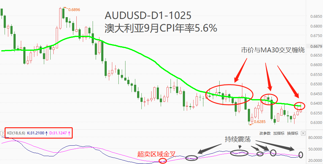 技术角度看,AUDUSD市价在9月14日与MA30交叉之后,连续多次向上突破失败,并与MA30反复交叉缠绕(图中红框部分),形成显著的震荡走势。与此同时,震荡指标KD在8月28日在超卖区间金叉后,连续多次在中部区域形成无意义的交叉(图中黑框部分),印证了市价震荡的结论。今日受数据影响,AUDUSD先涨后跌,再次与MA30交叉。预计本次突破会像以往那样归于震荡,适宜短线交易不适合长期持有。