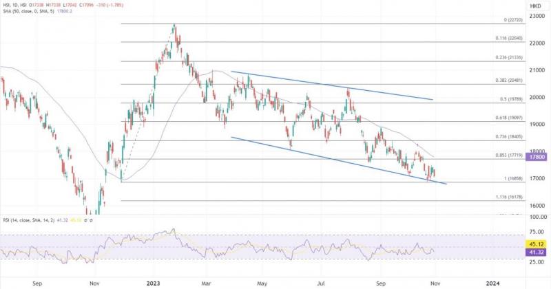部分权重股业绩公布后股价跟随走低,大市未能延续反弹模式,在10月最后交易日重新测试17000关口,月线已经录得三连跌,疲惫的情绪可能贯穿至11月开局,尤其如果跌破下行趋势线的情况下,16000关口将成为下一主要目标。