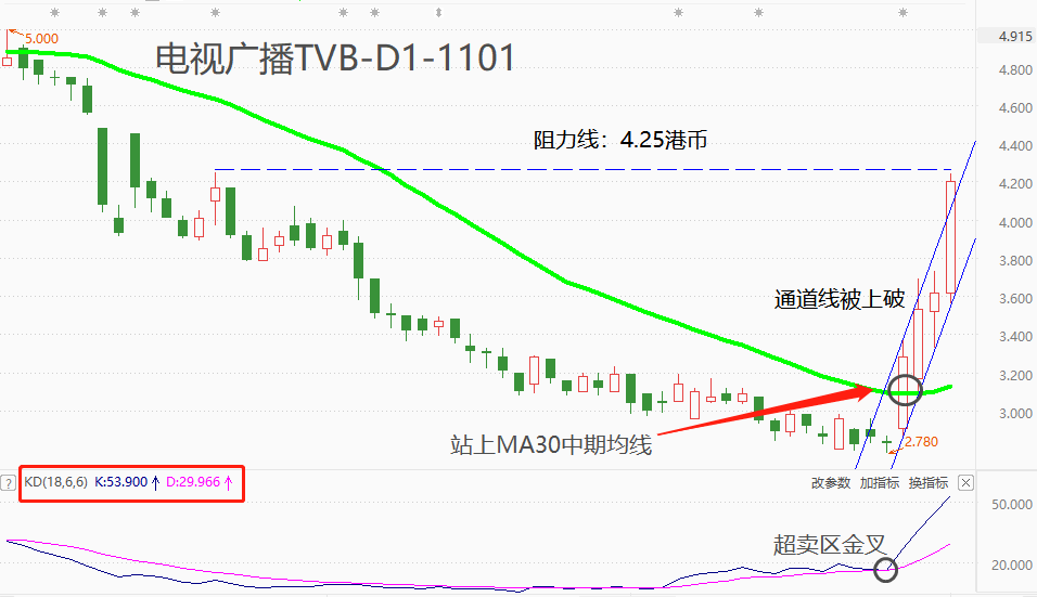 技术角度看,电视广播TVB的股价处于剧烈升势,10月27日突破MA30中期均线,确定“空转多”的结构。连续四根阳线所形成的上涨通道已经足够强势,今日长阳线突破通道上限,且市价距离阻力线4.25港币非常近,继续走高的压力较大,可能面临短期的回调走势。震荡指标KD的读数处于中间区域,代表涨势仍能在中短期延续,超卖区形成的金叉仍对行情起到支撑作用。