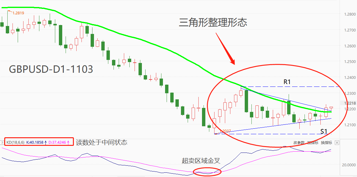 技术角度看,GBPUSD处于长期空头趋势下的反弹阶段,反弹波段从10月4日开始已经持续一个月时间,整体走势呈现出收敛三角形结构。市价已经来到三角形结构的突破节点,昨日的中阳线将收盘价推高在三角形上沿之外,有向上突破的迹象。如果未来两个交易日的收盘价均处于上沿之外,则形成有效突破,下一阻力位在R1位置。震荡指标KD的读数处于中间区域,意味着自10月5日形成的超卖区金叉仍对行情起到支撑作用,反弹行情仍有足够的上行空间。