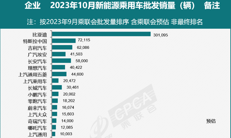乘联会2023年9月全国乘用车市场报告显示,新能源销量万辆以上的17家厂商,批发销量占总体新能源乘用车全月销量的88.4%,这些企业10月预估销量为78.7万辆,按照正常结构占比预测10月全国新能源乘用车销量在89万辆。