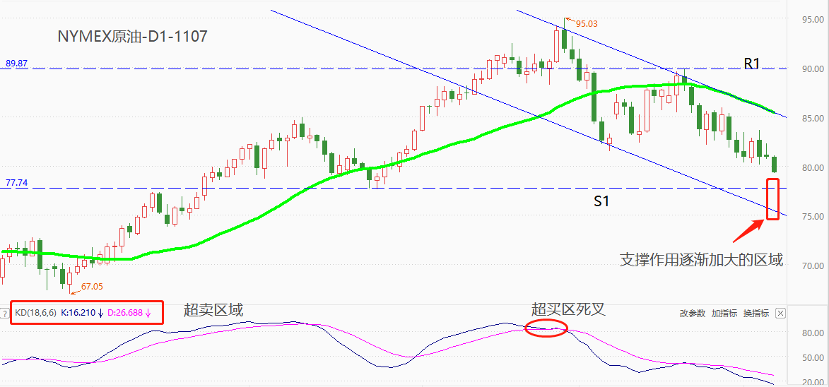 技术角度看,NYMEX处于长期多头趋势下的回调阶段,且市价距离下降通道线仍有一段距离,跌势大概率仍将延续。上方阻力位R1为10月20日高点89.85美元,下方支撑位S1为8月24日形成的低点77.59美元。除了S1支撑位外,下降通道线的下轨也对市价形成一定的支撑作用。震荡指标KD的读数已经进入超卖区域,行情继续下跌的空间不足,预计将会在图中红框附近触发大量买盘。支撑点作用有效的前提下,或引发新一轮涨势。