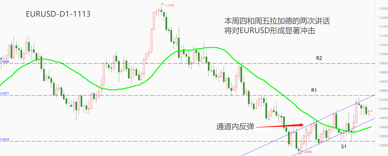 本周四19:30和本周五16:30,欧洲央行行长拉加德将发表最新讲话,重点关注其对欧元区宏观经济发展前景、通胀率和失业率数据表现、货币政策走向等方面的表态。如果表态偏鸽,将会对欧元币值形成严重冲击。EURUSD最新汇率1.0686,行情处于中期下跌趋势下的反弹阶段,任何有关经济前景的悲观发言都将冲击脆弱的反弹走势。如果拉加德表态意外偏鹰,EURUSD则有可能上破1.0757的短期阻力位。