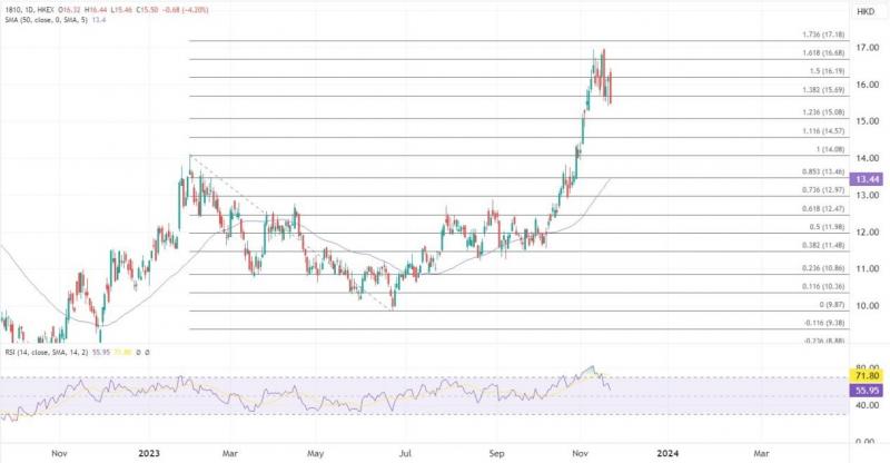 小米股价于第三季已经累计升15%,自10月份以来升势一路扩大,累计升将近50%。今日在绩后高开但迅速回吐,如果本周收低于15港元,则自上周高位17港元以来的调整扩大,在重新回升前或进一步指向14港元寻找支撑。不过业绩整体积极,后市仍会继续寻求高位突破,可关注19港元目标价。