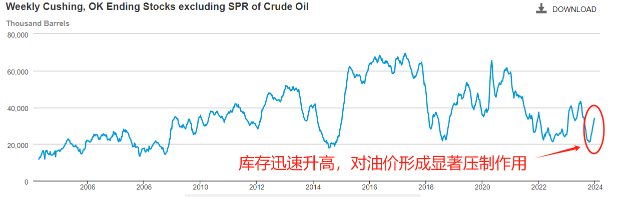 库存角度看,俄克拉荷马州库欣地区原油库存曲线正快速上升,对油价形成显著的压制作用。库存升高意味着供大于求,这与欧佩克组织无力扩大减产和美国宏观经济有可能在今年上半年陷入衰退的判断契合。经验角度看,原油的库存决定中短期走势,原油的需求决定中长期走势。由于库欣地区的库存曲线正在升高,并且美国宏观经济存在衰退预期,所以NYMEX原油的中短期和中长期的走势可能都将偏向空头。