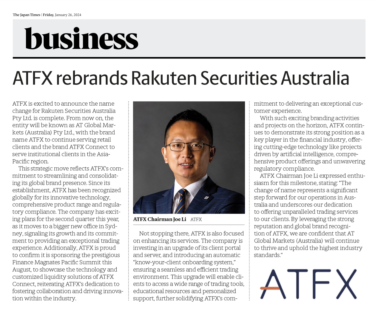 上一周,我司两则品牌新闻于1月25日及26日在全球知名的《日本时报》经济及商业版面被报道,分别是《ATFX:致力于卓越的全球领先在线交易经纪商》和《ATFX收购乐天证券澳大利亚公司品牌已改名》都获得了全球世界金融行业的关注。