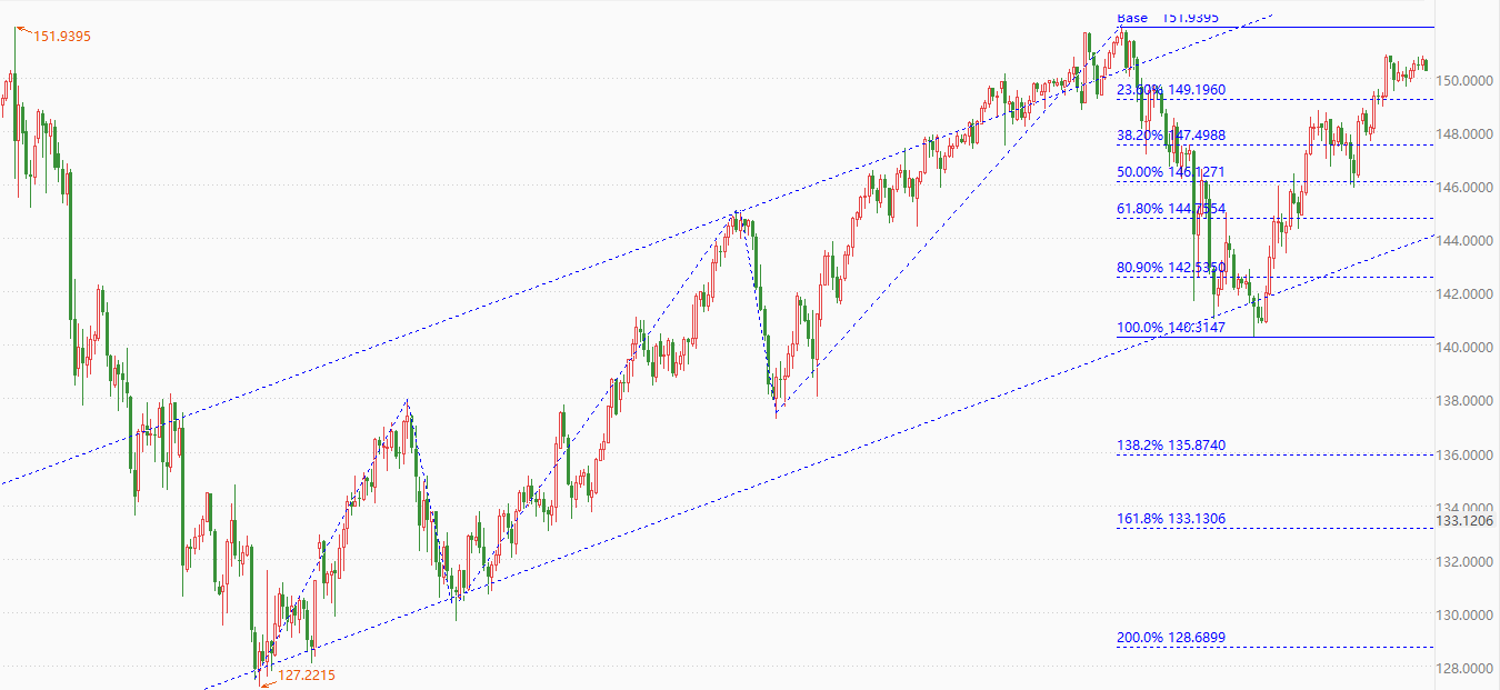 上图为USDJPY的日线级别走势图。技术角度看,USDJPY处于中长期上涨趋势之中。上升通道内的行情已经完成“5浪上涨结构”,未来有可能开启3浪下跌。今年1月初至今的反弹波段,最高点达到前一轮下跌波段的0.236分位上方。如果行情在此处遇阻,则调整浪的C浪下跌或将出现。如果上涨波段突破前一轮下跌波段的最高点151.90(当前市价为150.25),则波浪结构遭到破坏,后市延续上涨趋势的可能性较高。