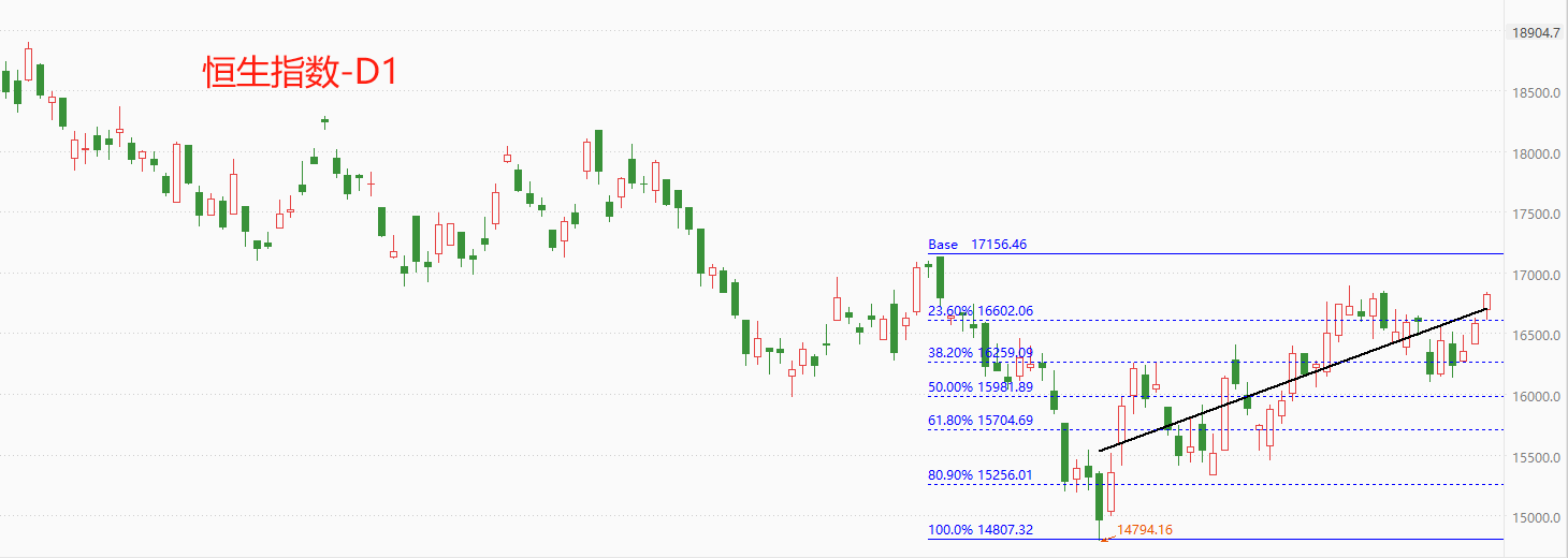 上图为恒生指数日线级别走势图。技术角度看,恒生指数日线已经三连阳,最高点16843(截至11:43),距离2月份最高点16895.8仅一步之遥,今日盘中刷新近两月最高点的可能性较大。图中黑色斜线为回归线指标,当市价远离黑色线时,回归拉力越大,直至形成顶分形结构后,反向走势开启。当前恒指的报价处于黑色回归线附近,回归拉力尚不发挥作用,预计短期涨势将会延续。