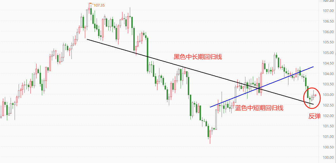 上图为美元指数日线级别走势图。技术角度看,开始于2月14日的下跌波段已经与中长期回归线重合,昨日收盘后重合部分确定形成底分形支撑结构,后市看涨。以中短期回归线的指向来看,本轮反弹可能会使得美元指数重新站上104关口。如果宏观经济环境配合,美指甚至可能刷新2月份新高。需要提醒的是,目前市场的主流预期仍然是“美联储将提前降息”,所以美指短期反弹结束后继续下破中长期的回归线的可能性仍然存在。